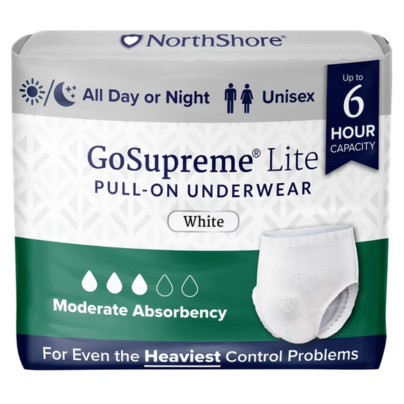 Lightweight and breathable, GoSupreme Lite pull-on underwear offers premium leak protection with top-of-the-line comfort. The super absorbent core locks in odors and wetness for up to 6 hours while keeping skin dry. The extra-long contoured lining provides extra protection in the front and rear for bladder or bowel voids. Strong waist and leg elastics hug the body even when wet to ensure a snug fit.