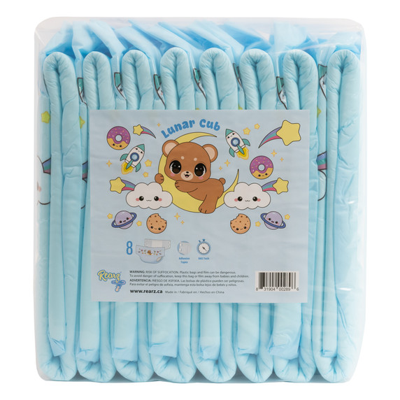 The diaper boasts a soft baby blue plastic backing, evoking the peaceful glow of a moonlit night. But it’s not just about looks—Lunar Cub is designed to ensure maximum comfort with a thicker and fluffier core, providing out-of-this-world protection. Whether you're exploring the city, enjoying a cozy day at home, or venturing into cosmos, Lunar Cub briefs promise to keep you dry and comfortable for longer. Get yours today and join the Lunar Cub Club!